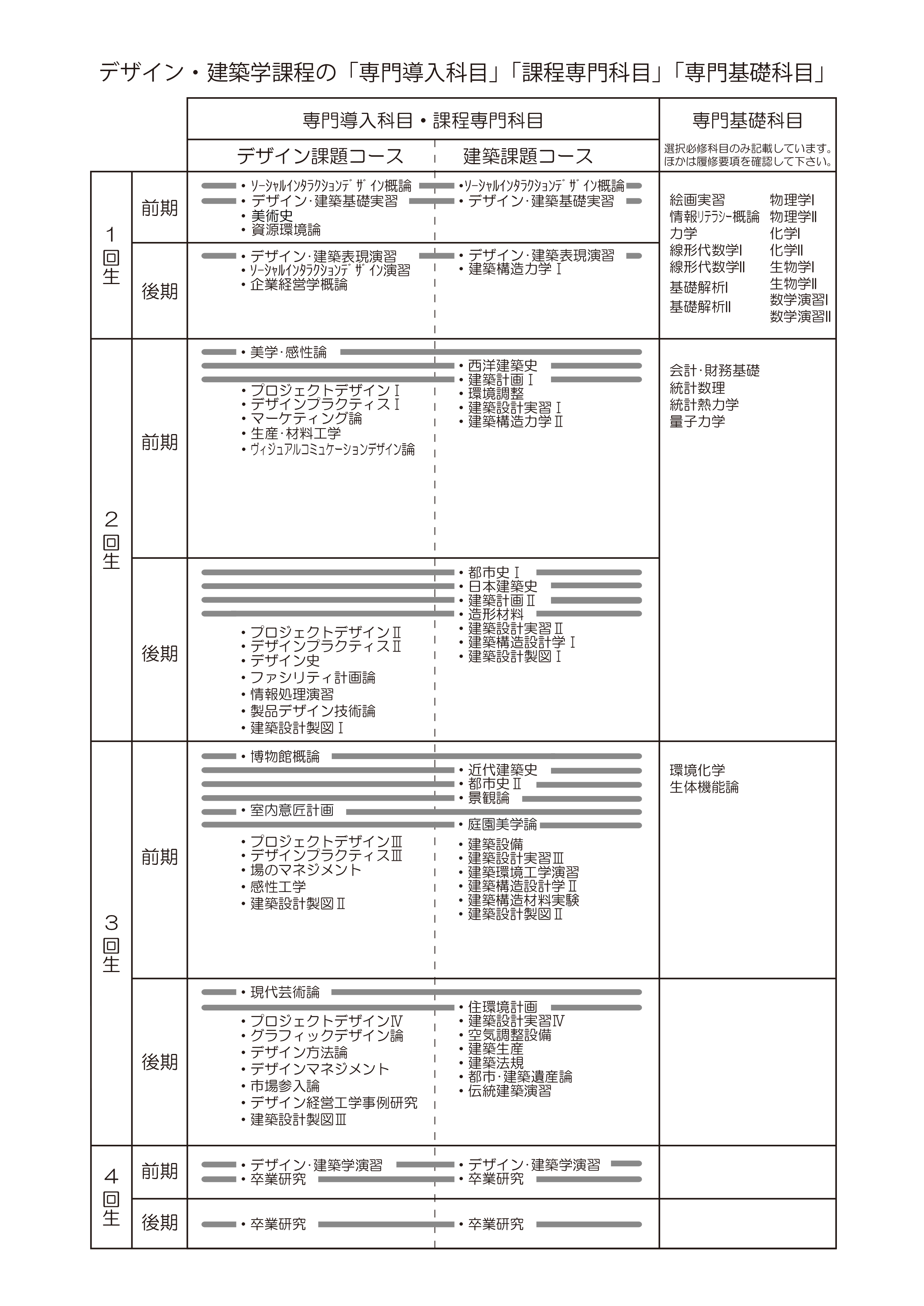 専門科目のカリキュラムは、必修の専門導入科目、専門基礎科目(選択必修科目と選択科目で構成されます)に加え、A群科目(建築系)、B群科目(デザイン系)、C群科目(芸術系&マネジメント系&エンジニアリング系)、D群科目(制作実習・演習)の選択必修科目、幅広い分野にわたる選択科目、そして必修の卒業研究があります。これらの科目をバランスよく学習すれば、21世紀社会の暮らしを心から豊かにする総合的構想力を、デザインや建築の実習とその基礎となる造形理論、人文社会科学、工学を学びながら、着実に身につけることができるように設計されており、将来、デザインや建築の専門家、またデザインマインドやビジネスマインドをもった実践家・技術者・研究者になる人にとって有益なプログラムとなっています。